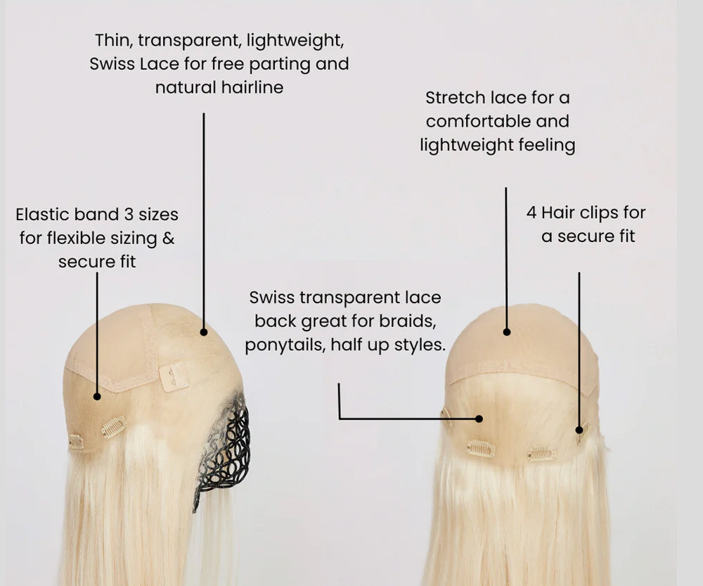Våre parykker er laget med glueless lace, som betyr at du kan bruke dem uten lim eller tape. De passer komfortabelt og sikkert ved hjelp av justerbare stropper og klips som enkelt kan festes for best mulig passform.