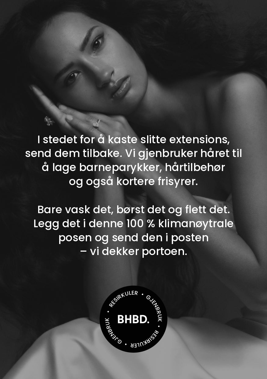 I stedet for å kaste slitte extensions, send dem tilbake. Vi gjenbruker håret til å lage barneparykker, hårtilbehør og korte frisyrer. Les mer om hvordan du leverer hår til resirkulering.